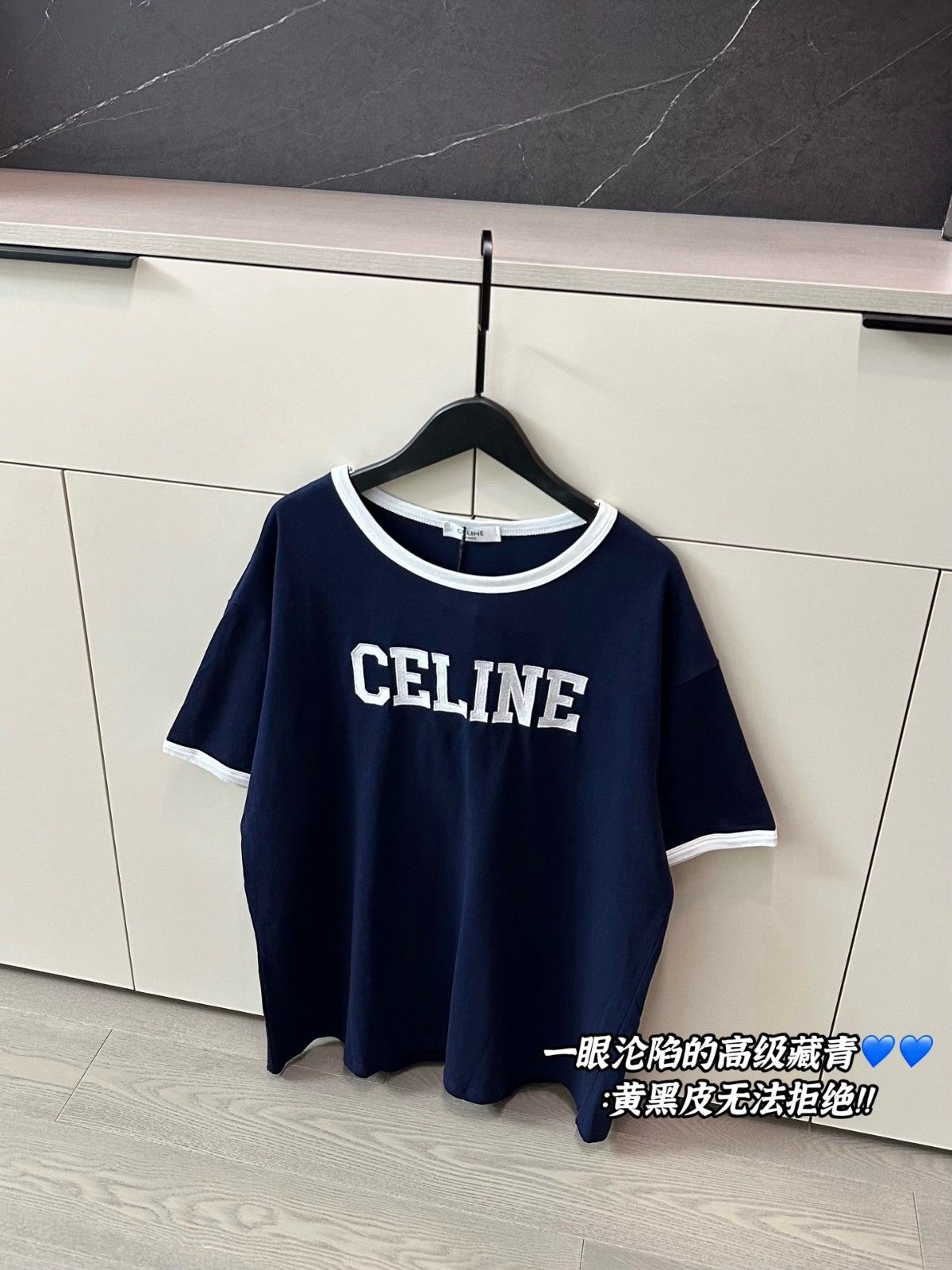 セリーヌ 半袖Tシャツ 文字刺繍入り ネイビー A30473